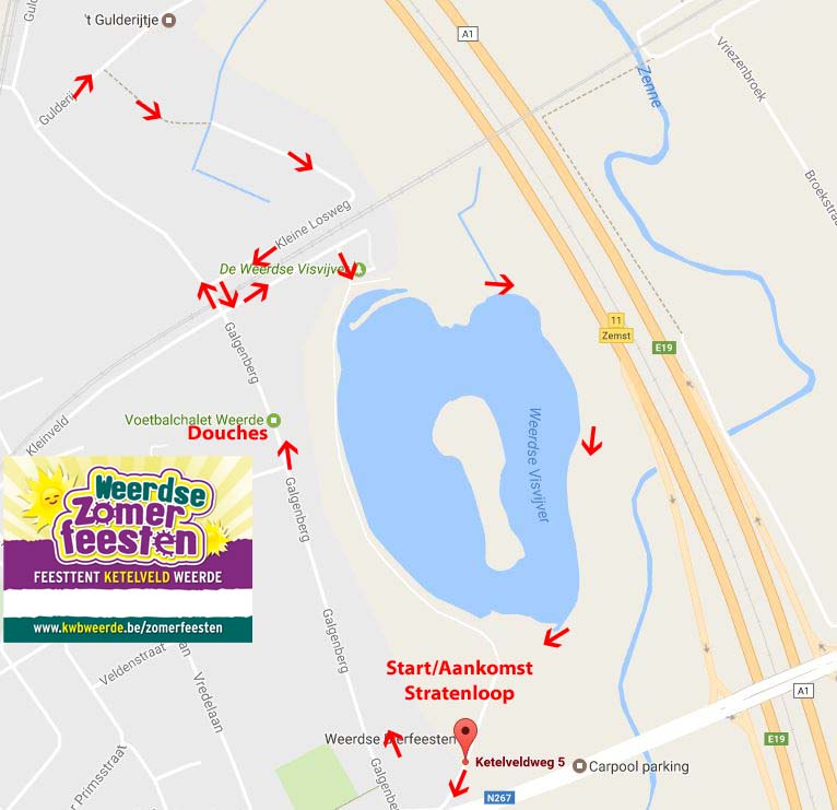 Er wordt gelopen op een volledig verkeersvrij en vlak parcours, langsheen de Weerdse visvijver. Vertrek en aankomst zijn gelegen aan de feesttent aan de Ketelveldweg.